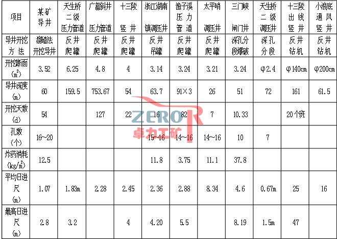 各種豎井導(dǎo)井開挖方法指標(biāo)比較  將各種豎井導(dǎo)井開挖方法的有關(guān)技術(shù)指標(biāo)列入表2-1
