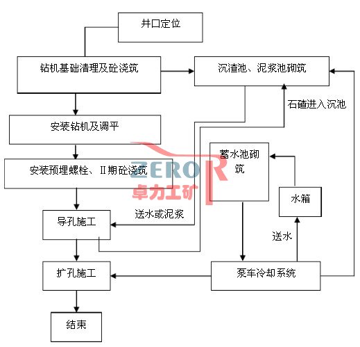 作業(yè)平臺的施工 反井鉆機(jī)基礎(chǔ)及循環(huán)水池的施工 安裝液壓系統(tǒng)冷卻循環(huán)水箱 安裝反井鉆機(jī)并進(jìn)行調(diào)試 由上往下鉆進(jìn)Φ216mm導(dǎo)孔 導(dǎo)孔貫通后,拆除導(dǎo)孔鉆頭,安裝Φ1.4m擴(kuò)孔鉆頭,由下往上進(jìn)行擴(kuò)孔施工 拆除鉆機(jī)及井口好防護(hù)