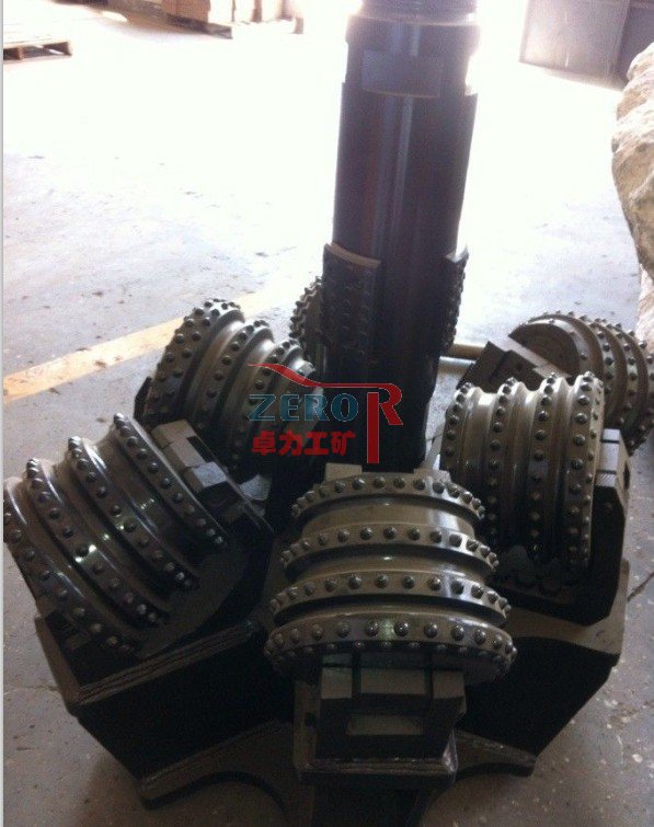 反井鉆機(jī)滾刀選擇后,根據(jù)巖石條件在擴(kuò)孔鉆頭合理布置滾刀, 也就可以確定,破碎巖石需要的最大鉆壓。  如在抗壓強(qiáng)度100MPa的巖石中,鉆進(jìn)深度200m、直徑1.4m的鉆孔,在擴(kuò)孔鉆頭上需要布置6把中硬巖滾刀,每把滾刀需要約30kN破巖壓力,整個(gè)鉆頭的破巖鉆壓180kN。