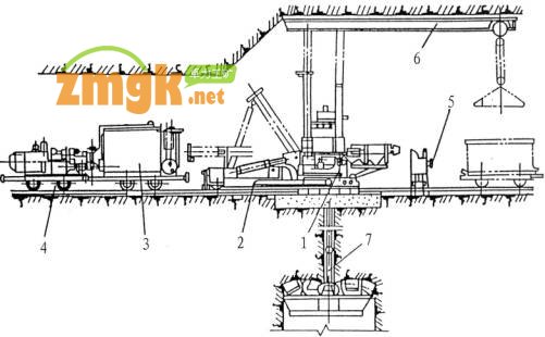 6-吊掛裝置 7-鉆機(包括三牙輪鉆頭、鉆桿、擴孔刀盤)